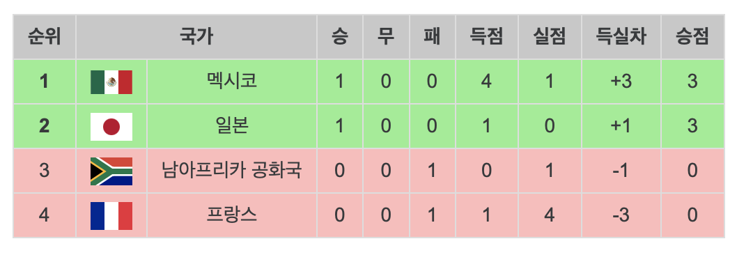 현재 멕시코가 1승 골득실 +3으로 일본을 득실에서 앞서 1위, 일본이 조2위에 올라있습니다. A조는 우리에게도 관심이 많이 가게되는 조로 A조 1,2위로 8강에 올라오는 팀과 B조 1,2위 팀이 8강에서 만나게 되고, 한국과 일본이 만나게 되면 그야말로 시청률 대박이 보장되는 축구한일전이 성사되게 되는 것입니다.