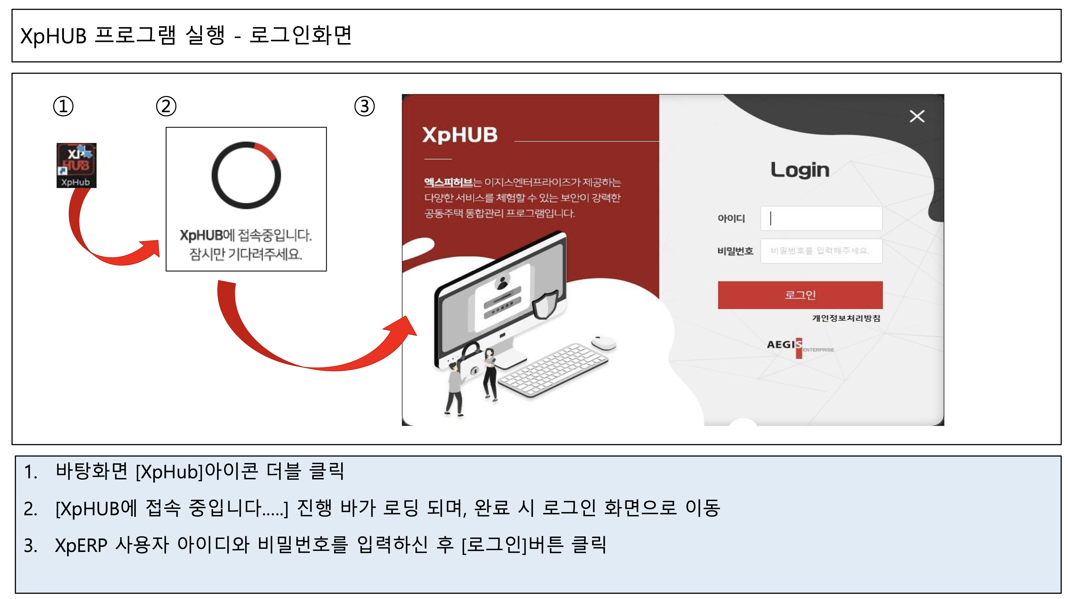 바탕화면 엑스피허브 파일 더블클릭 후 접속 - 로그인 화면에서 사용자 아이디와 비밀번호 입력 후 로그인 완료.